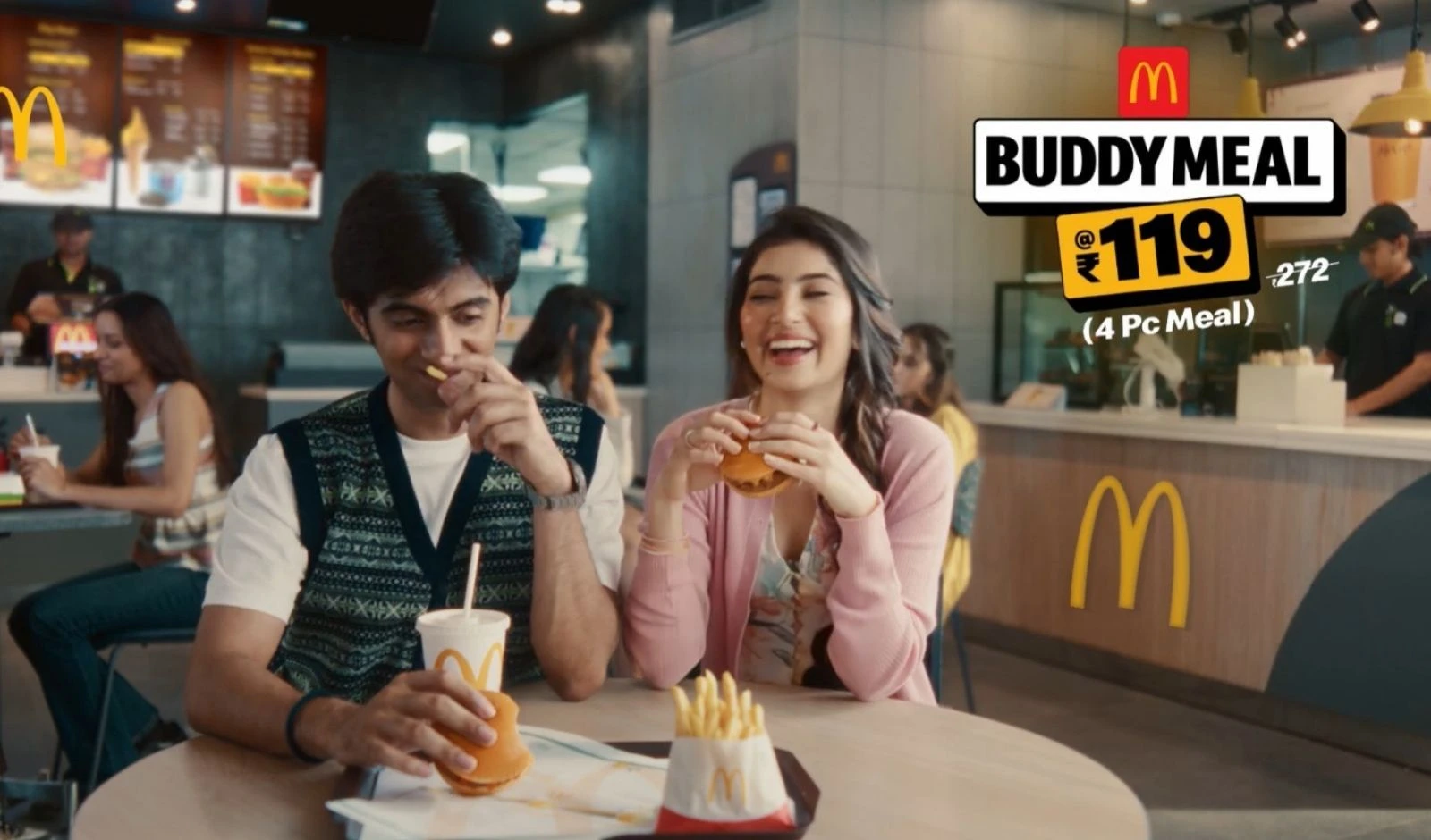The commercial concludes with the voiceover message, “Shukar hai McDonald’s Buddy Meal for 2 hai… starts at just Rs 119.” The campaign closes with the pair sharing the Buddy Meal, reinforcing the brand message “Khao Meal, Baat Ke,” which focuses on sharing and value.