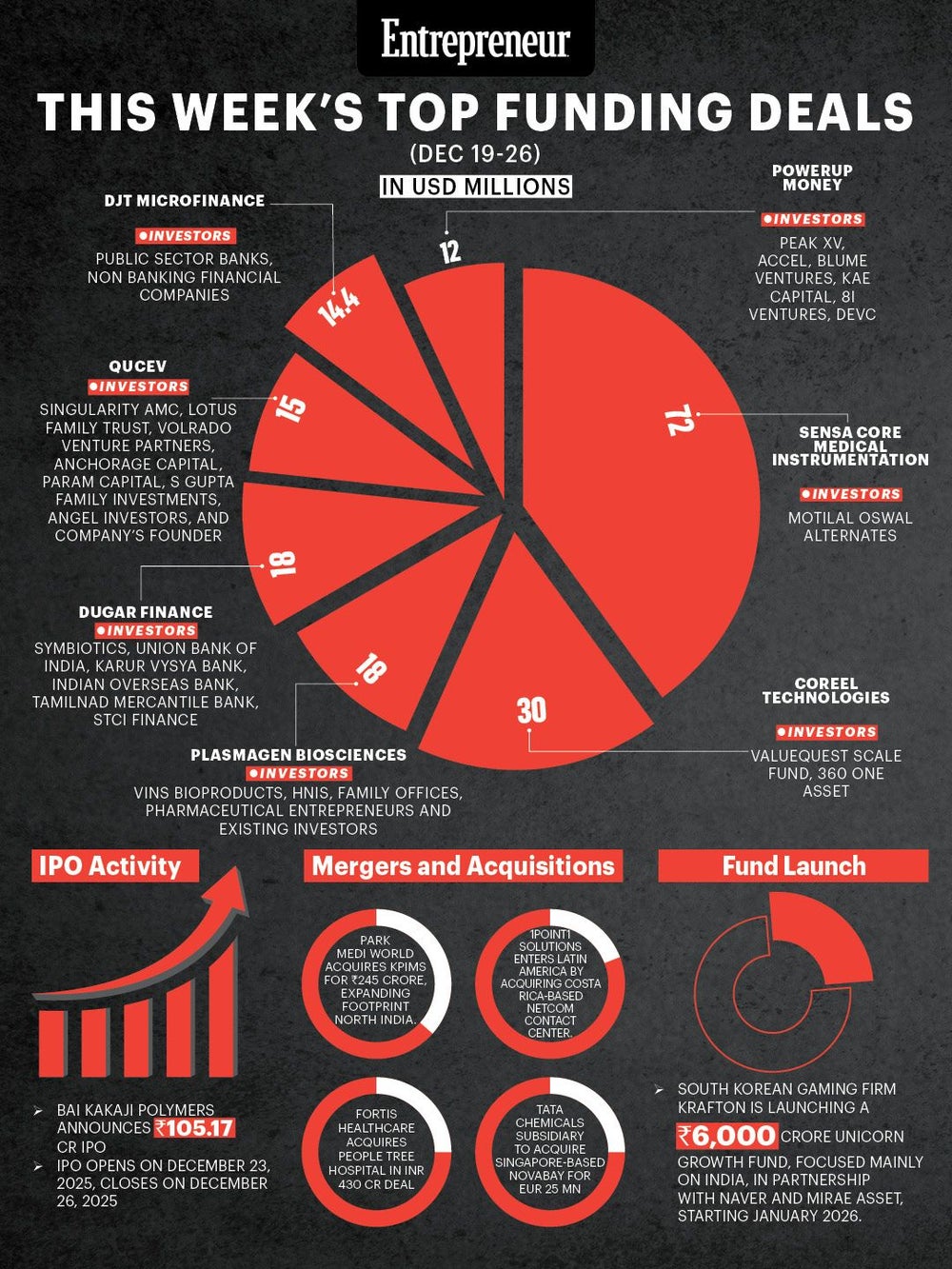 India’s startup and corporate ecosystem remained active during the week of December 19-26 with significant capital inflows across healthtech, defence electronics, fintech, EV manufacturing and wealth management. Large late-stage rounds, strategic acquisitions in healthcare and BPM, an SME IPO, and the announcement of a mega technology-focused fund highlighted strong investor confidence despite global uncertainties.